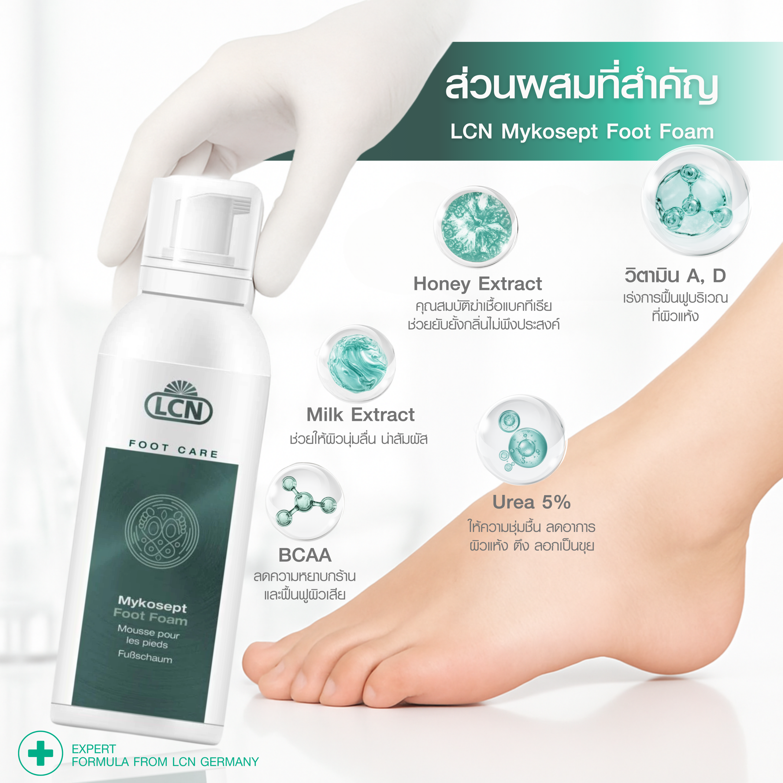 นอกจากนี้ เรายังมีผลิตภัณฑ์ดี ๆ จากเยอรมนีมาแนะนำ นั่นคือLCN Mykosept Foot Foam โฟมบำรุงเท้านำเข้าที่จะมาเป็นตัวช่วยกู้ผิวเท้าของคุณให้เนียนนุ่มแม้ในช่วงหน้าฝน