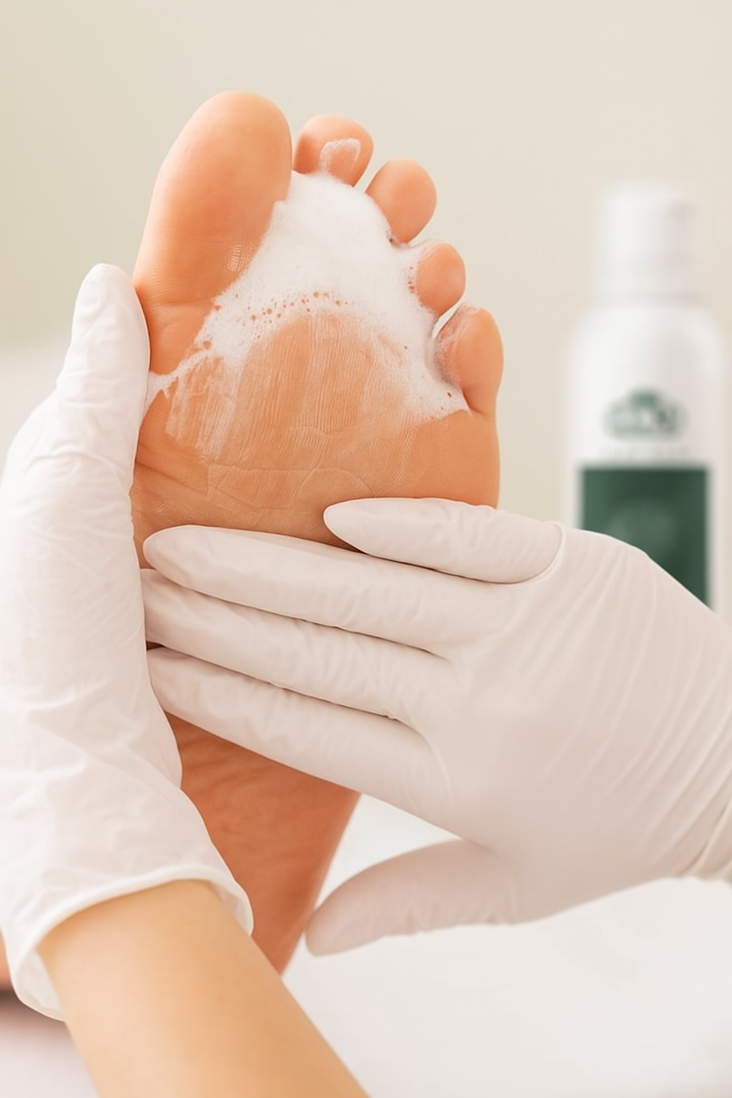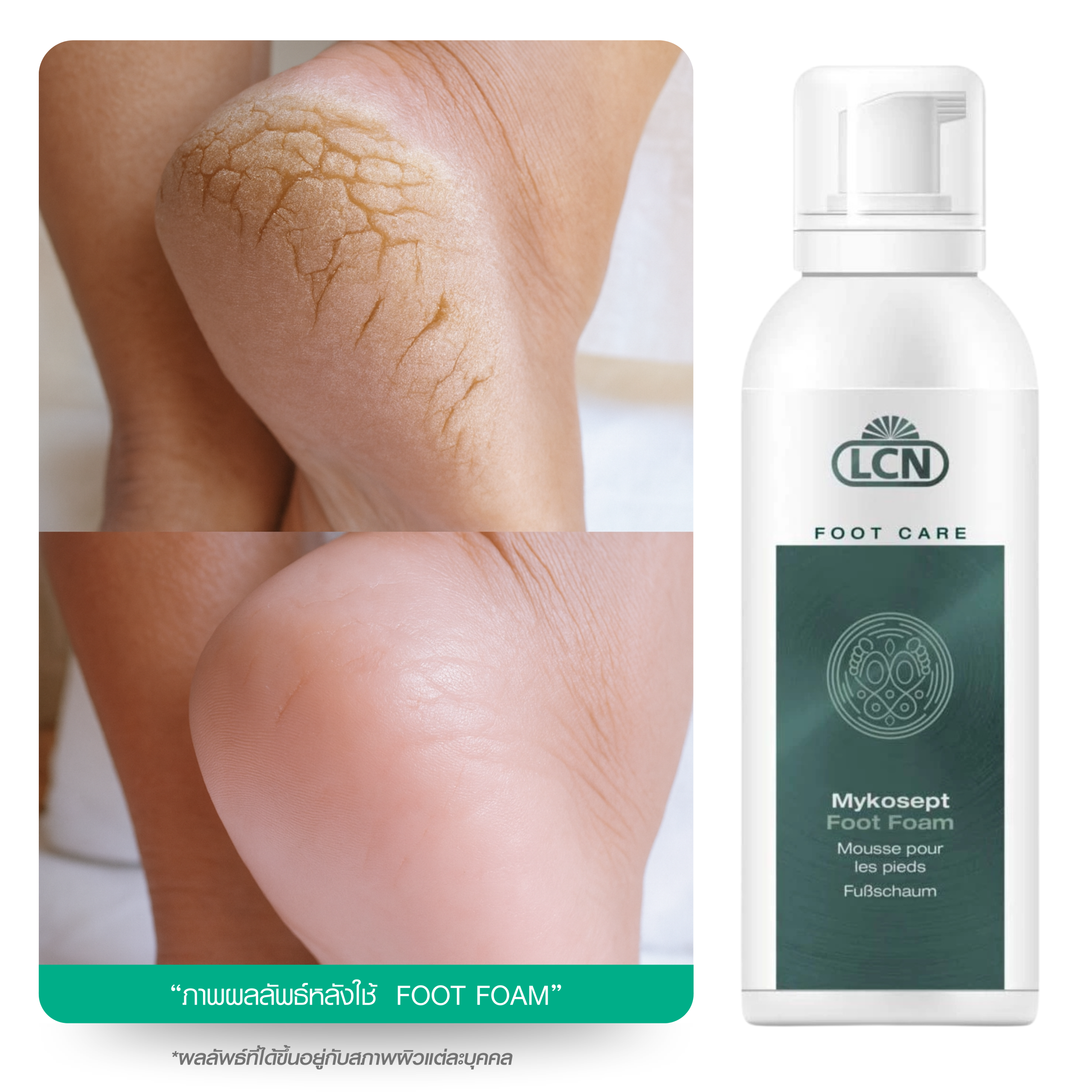 - ที่บ้าน: LCN Mykosept Foot Foam เหมาะสำหรับการใช้ดูแลเท้าประจำวันได้ง่าย ๆ ด้วยตัวเอง หลังอาบน้ำหรือก่อนนอน ให้เขย่ากระป๋องแล้วฉีดโฟมลงบนฝ่ามือ (ถือกระป๋องให้ตรงขณะฉีด) จากนั้นทาโฟมลงบนเท้าบริเวณที่ผิวแห้งหรือส้นเท้าที่แตก แนะนำให้ใช้วันละ 2 ครั้ง คือเช้าและก่อนนอน หรือใช้บ่อยตามต้องการในบริเวณที่ผิวแห้งกร้าน โฟมจะซึมเข้าผิวภายในไม่กี่นาทีและไม่ทิ้งความเหนอะหนะ สามารถใส่ถุงเท้าหรือรองเท้าต่อได้ทันที
