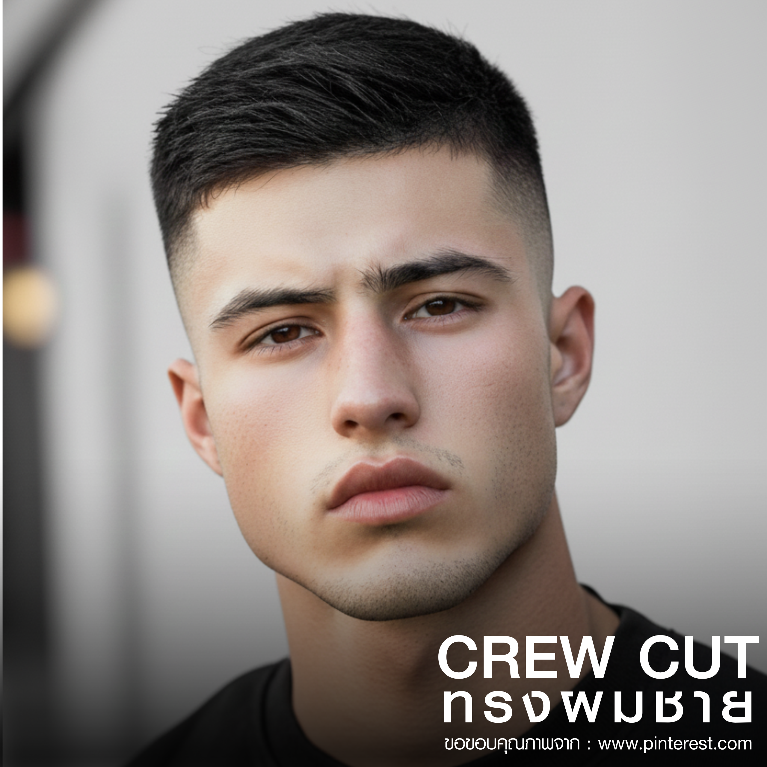 Crew Cut ด้านข้างสั้น ส่วนบนยาวเล็กน้อย หวีขึ้นหรือปัดข้างได้ ให้ลุคสะอาดเรียบร้อย นักเรียน นักศึกษา หรือหนุ่มออฟฟิศที่ต้องการลุคสุภาพ เป็นมืออาชีพ (เหมาะกับผู้ที่มีผมตรงหรือไม่หนามาก)