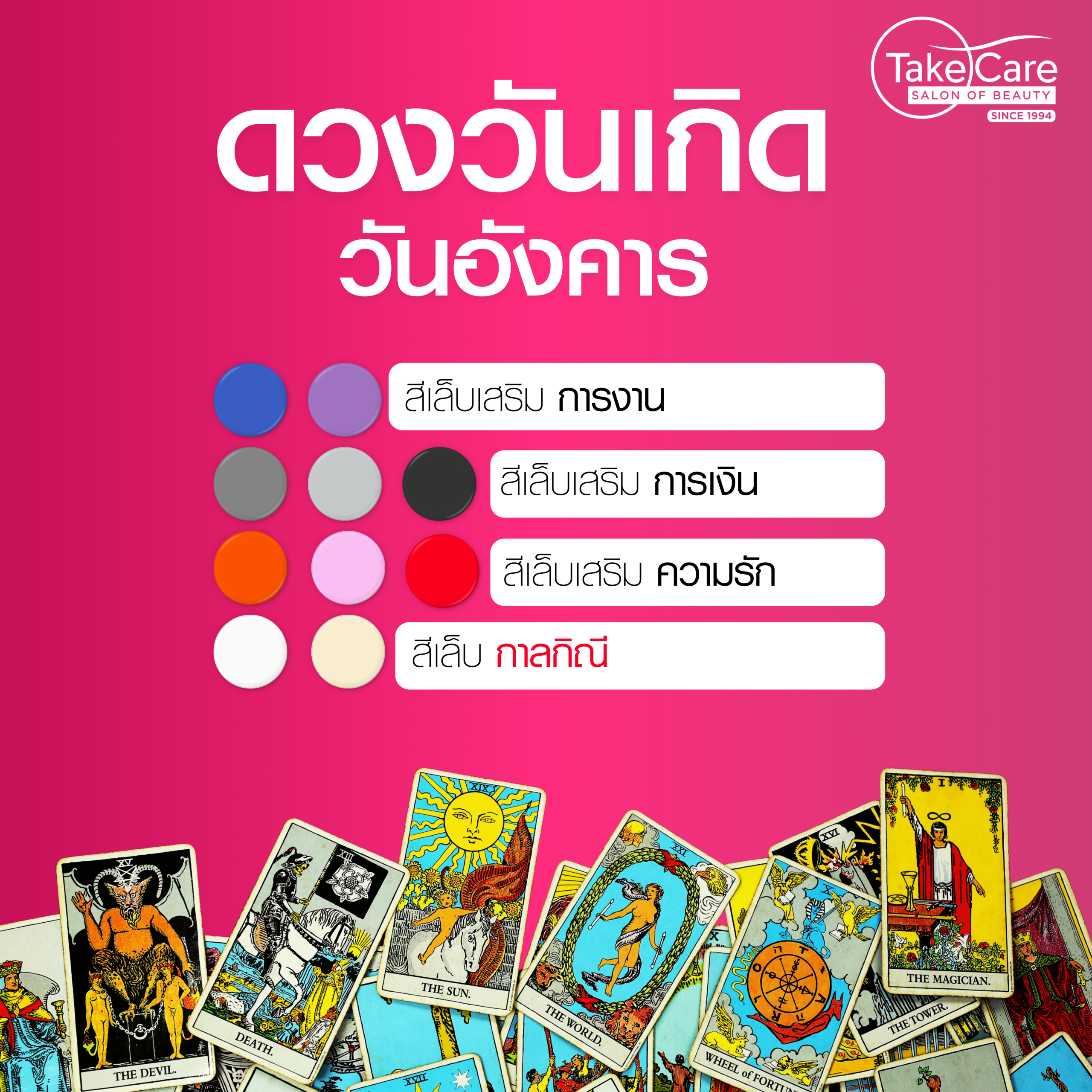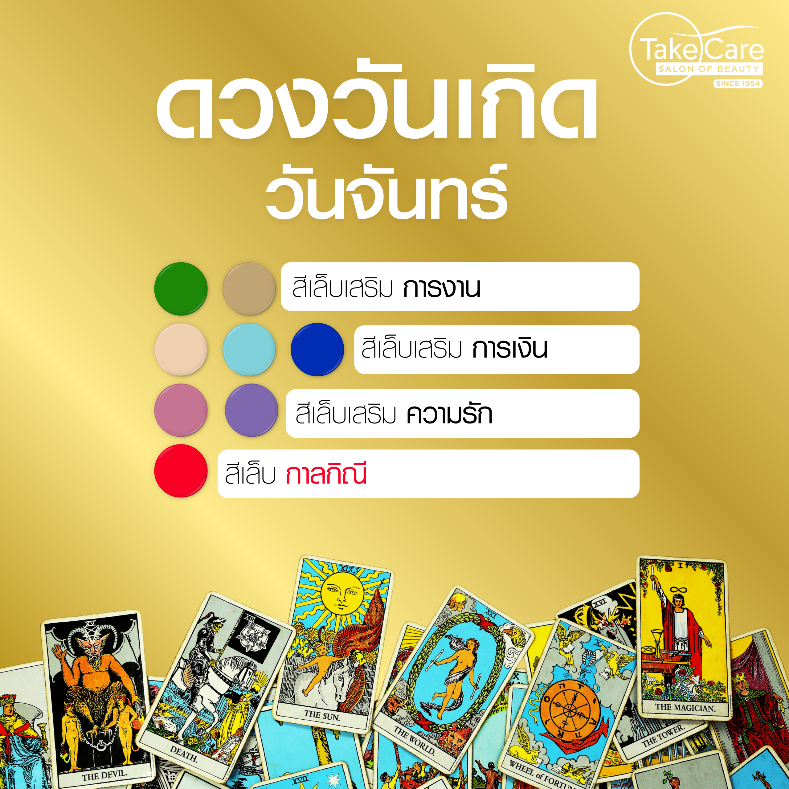 อัปเดต! สีเล็บมงคล 2569 ตามวันเกิด ทาแล้วรับทรัพย์ รักรุ่ง งานพุ่ง เสริมดวงปังตลอดปี ที่ Take Care Salon Of Beauty – ร้านทำเล็บพรีเมียมที่เข้าใจทั้งความงามและพลังดวง ในโลกของความงามระดับไฮเอนด์ “สีเล็บ” ไม่ได้เป็นเพียงรายละเอียดเล็กๆ แต่คือภาพสะท้อนพลัง ความรู้สึก และตัวตนของผู้สวมใส่ โดยเฉพาะในปี 2569 ซึ่งเป็นปีแห่ง “การเปลี่ยนจังหวะชีวิต” หลายศาสตร์ทั้งโหราศาสตร์ไทย ฮวงจุ้ย และจิตวิทยาสี ต่างชี้ตรงกันว่า สิ่งเล็กๆ ที่อยู่กับตัวเราตลอดเวลา เช่น สีเล็บมงคล 2569 สามารถช่วยปรับพลัง เสริมโอกาส และคุมอารมณ์ได้อย่างมีนัยสำคัญ