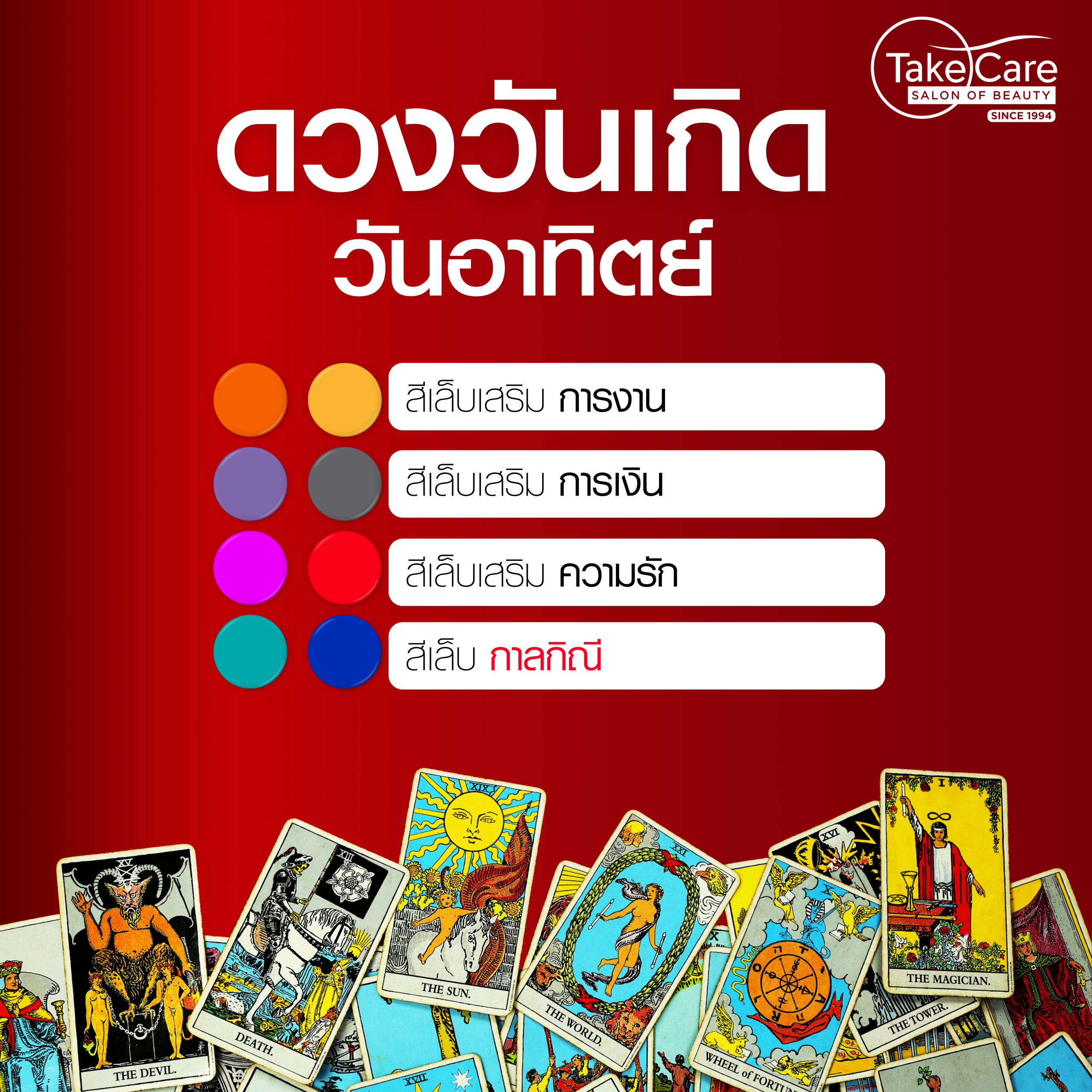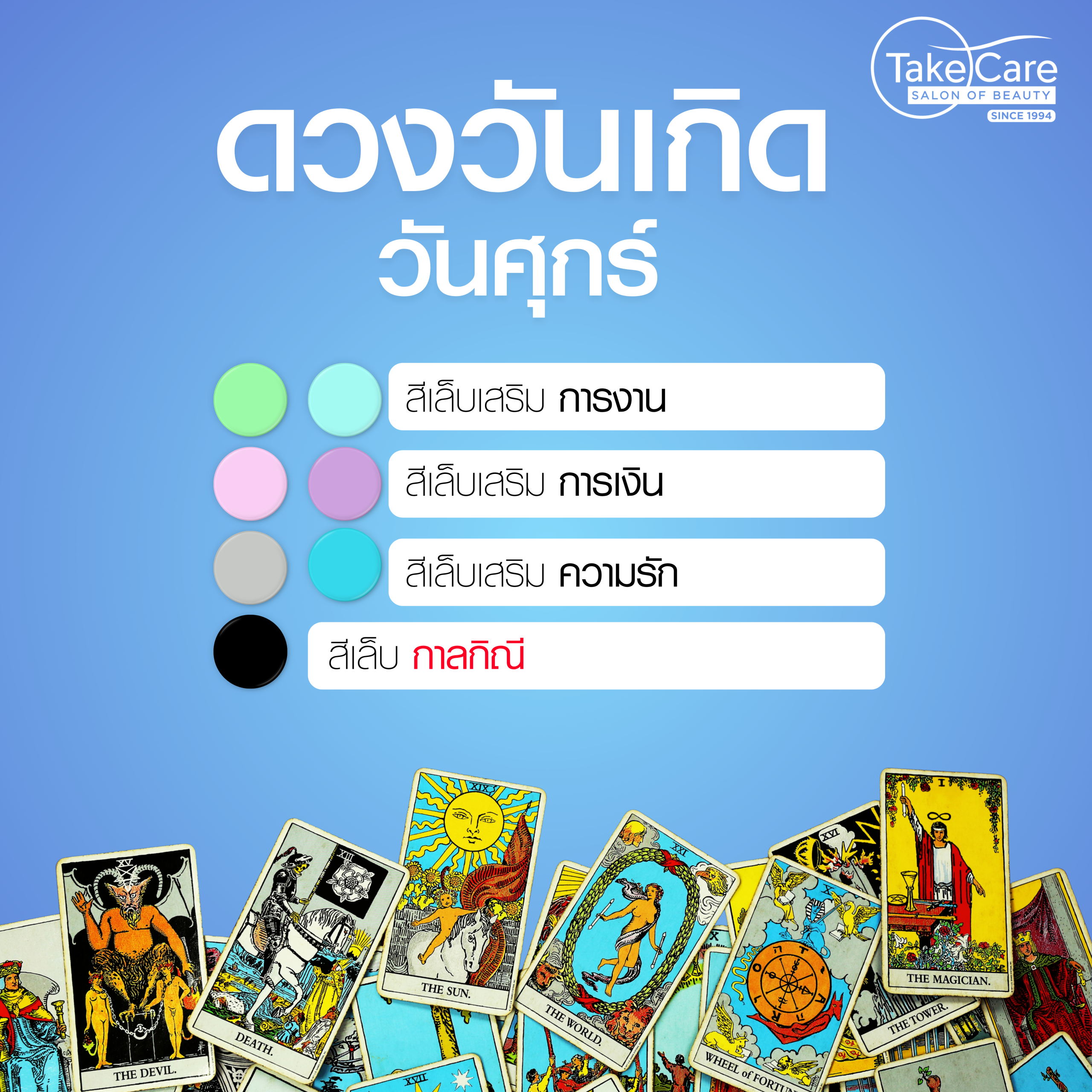 บทความนี้ Take Care Salon of Beauty ขอพาคุณอัปเดต สีเล็บมงคลตามวันเกิด แบบเชิงลึก ครบทั้ง การงาน การเงิน ความรัก สีเล็บกาลกิณี พร้อมแนะนำ สไตล์เล็บเจลสวยๆ 2569 ที่ทั้งดูแพงและเสริมดวงไปพร้อมกัน!