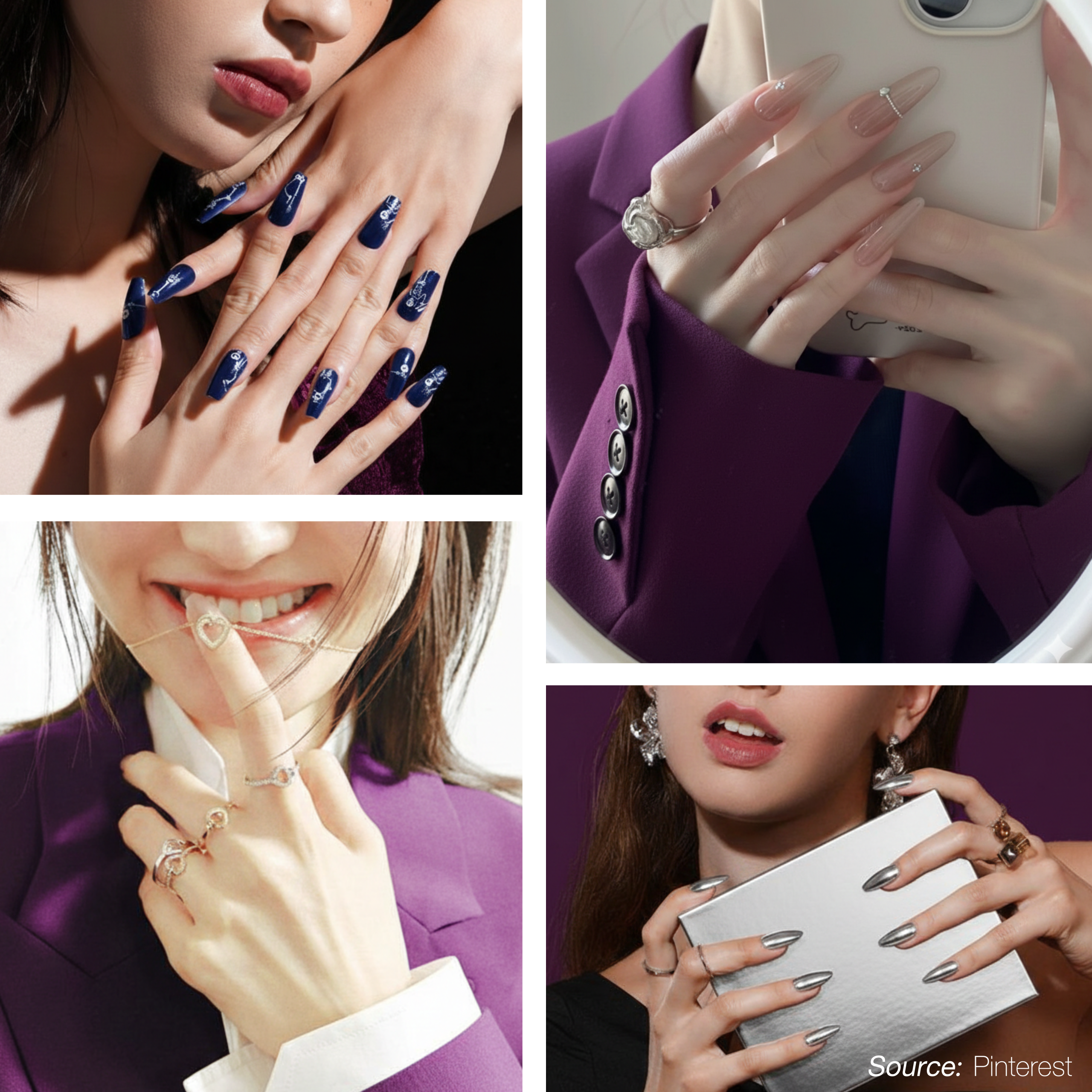 สไตล์เล็บแนะนำ: Chrome เงิน / Metallic purple / เล็บเงาคม ลุคมั่นใจ ทรงพลัง และดูแพงแบบมืออาชีพ