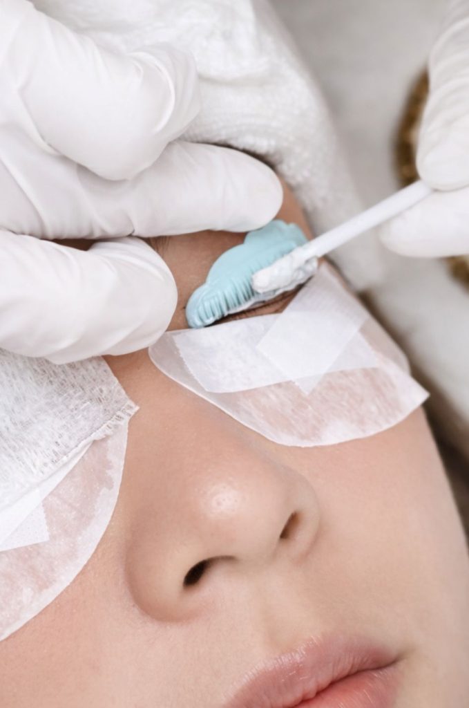 A setting lotion is carefully applied to secure the lashes in place, ensuring they hold their lifted shape.