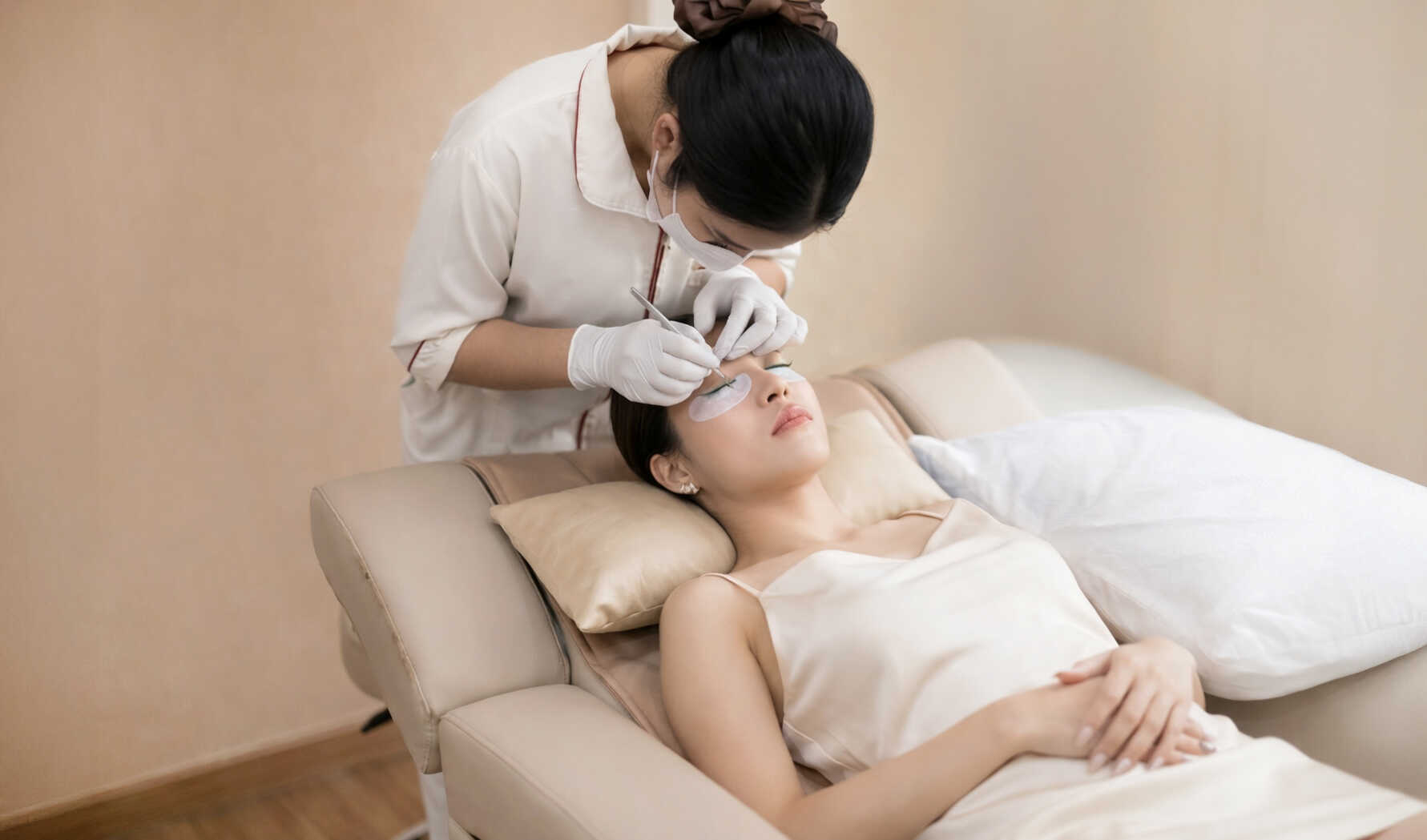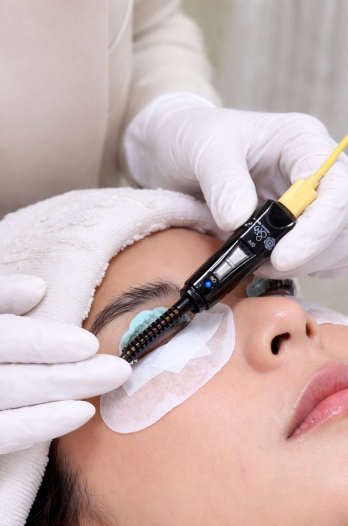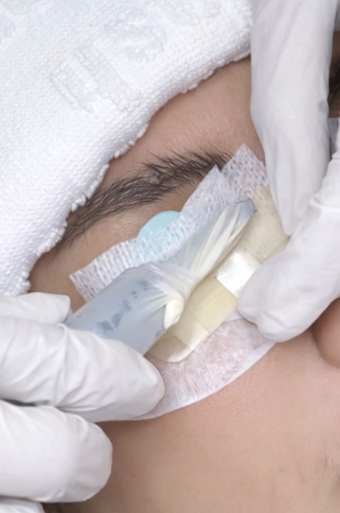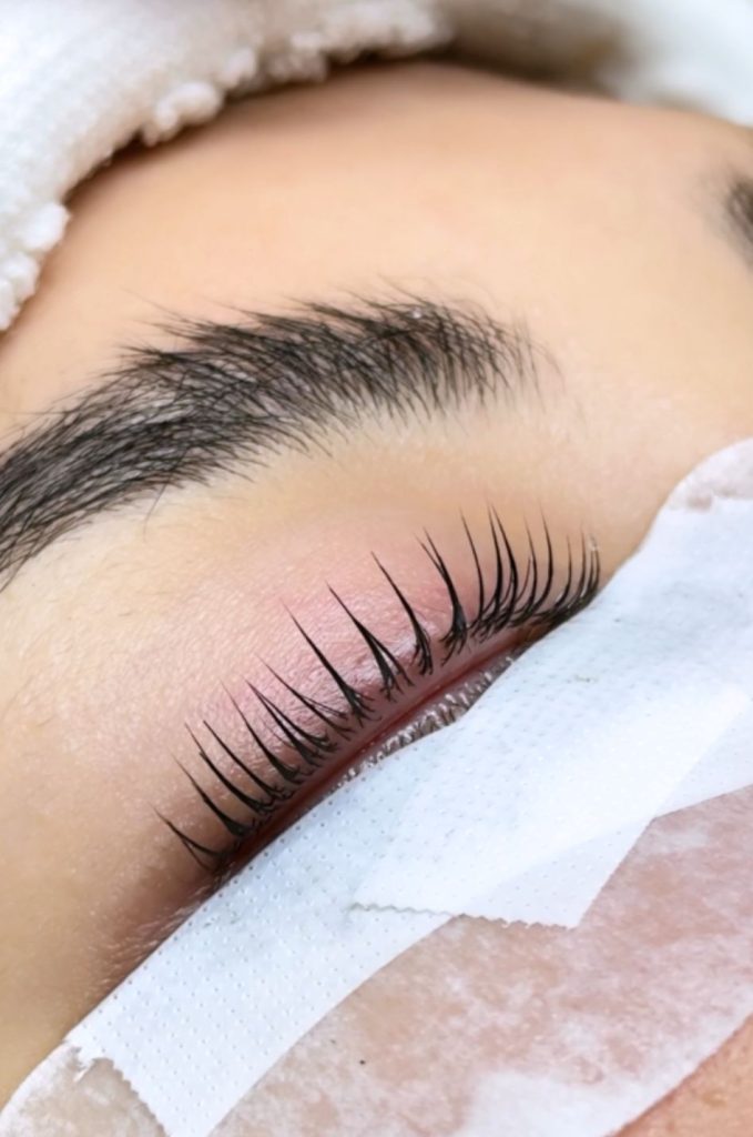 A perm lotion is applied, followed by a gentle warming mask to soften and reshape the lash structure for a lasting lift.
